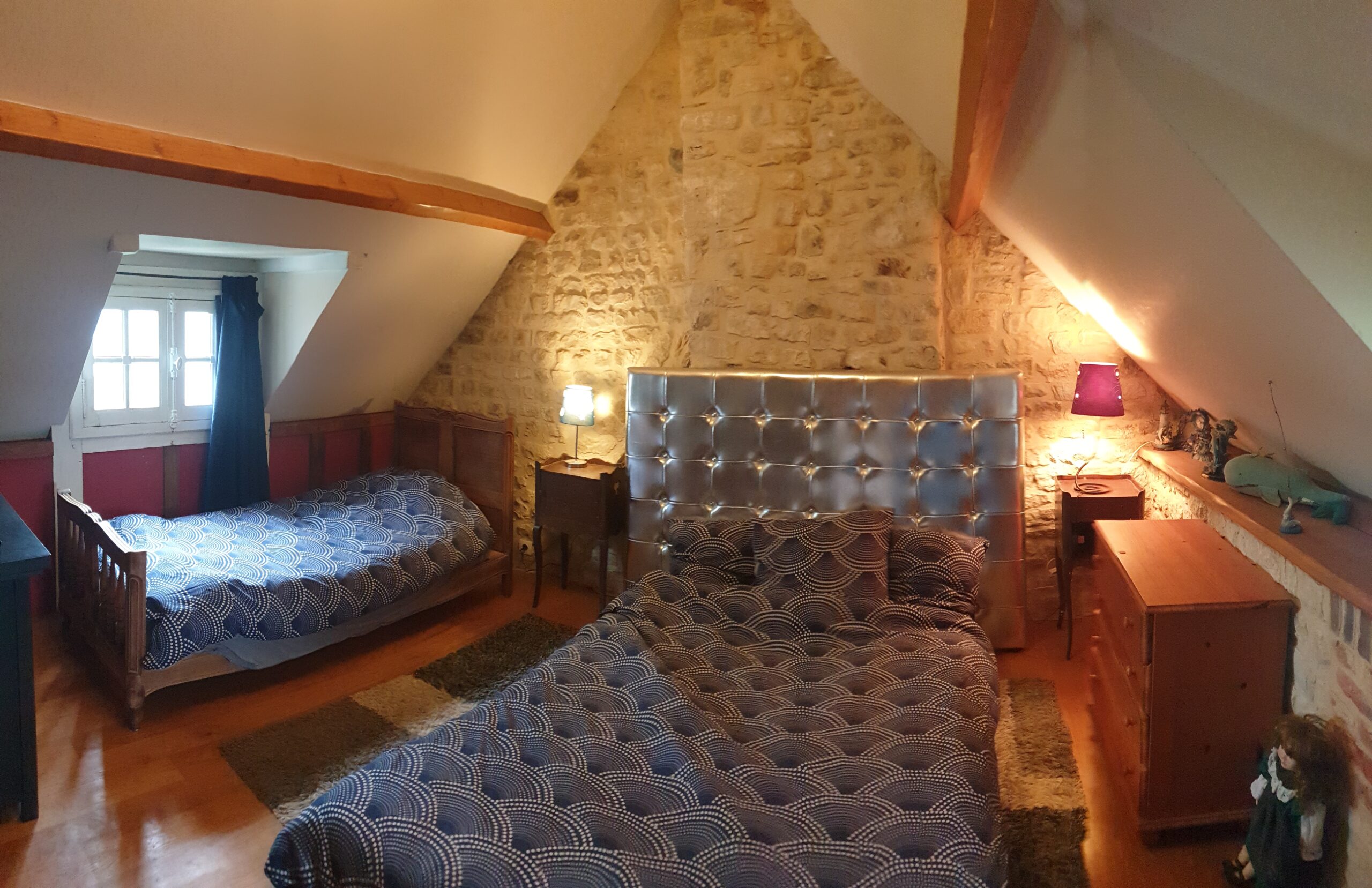 Chaque chambre est équipée d’un lit double (140x190) et d’un lit simple, avec une ambiance chaleureuse et authentique. L’une d’elles conserve encore les cordages d’époque utilisés pour hisser les sacs de blé vers la meule.